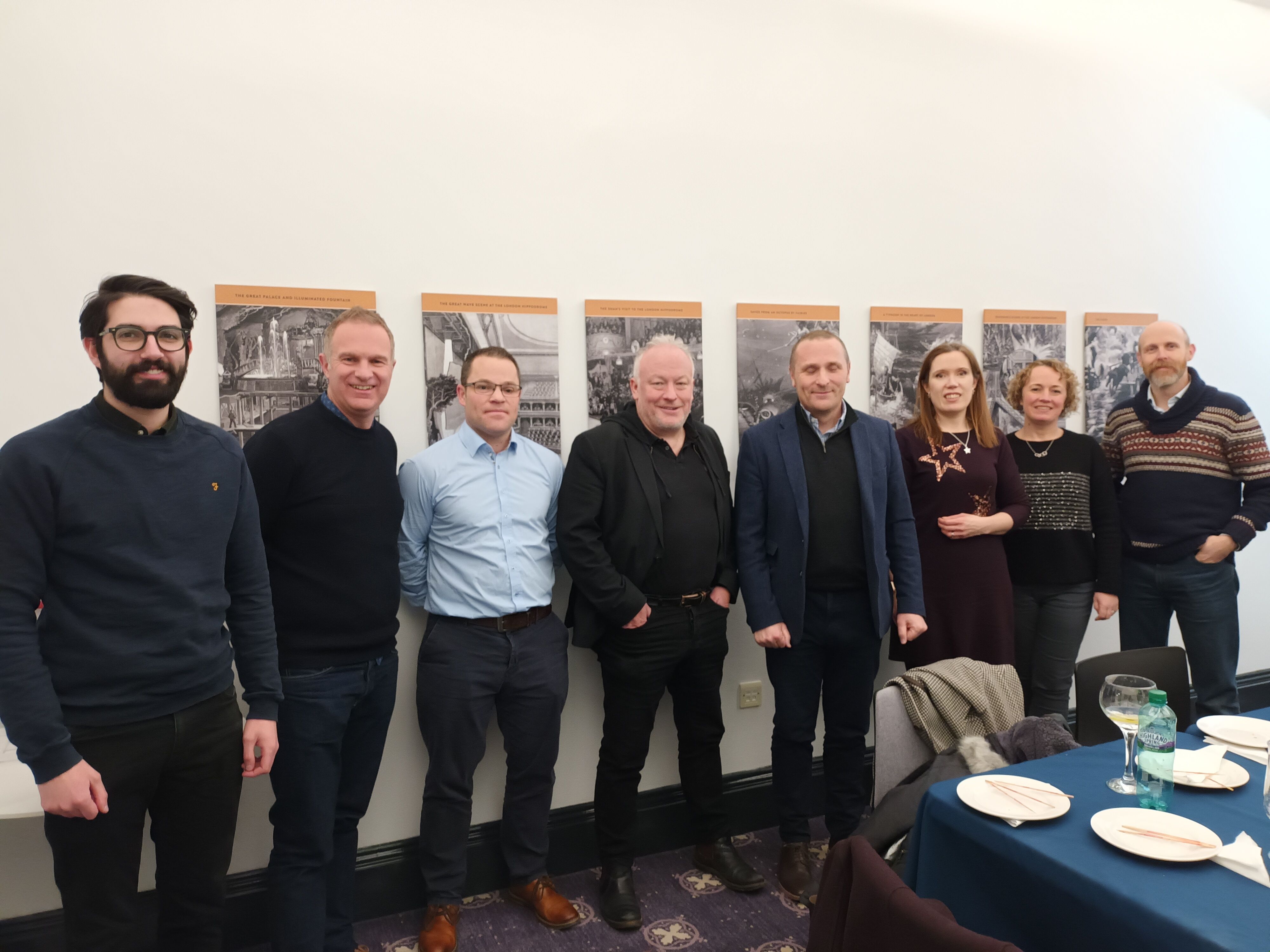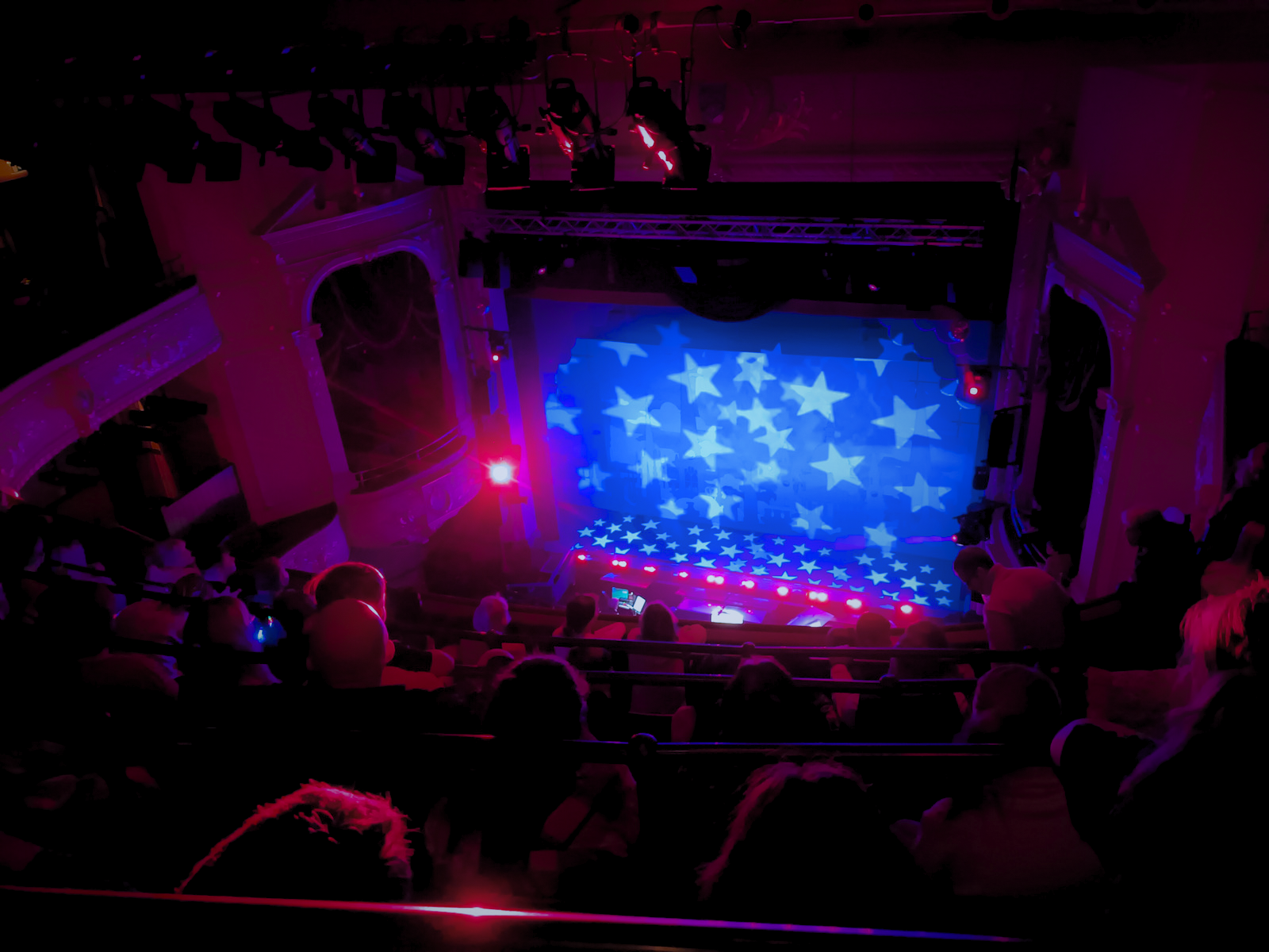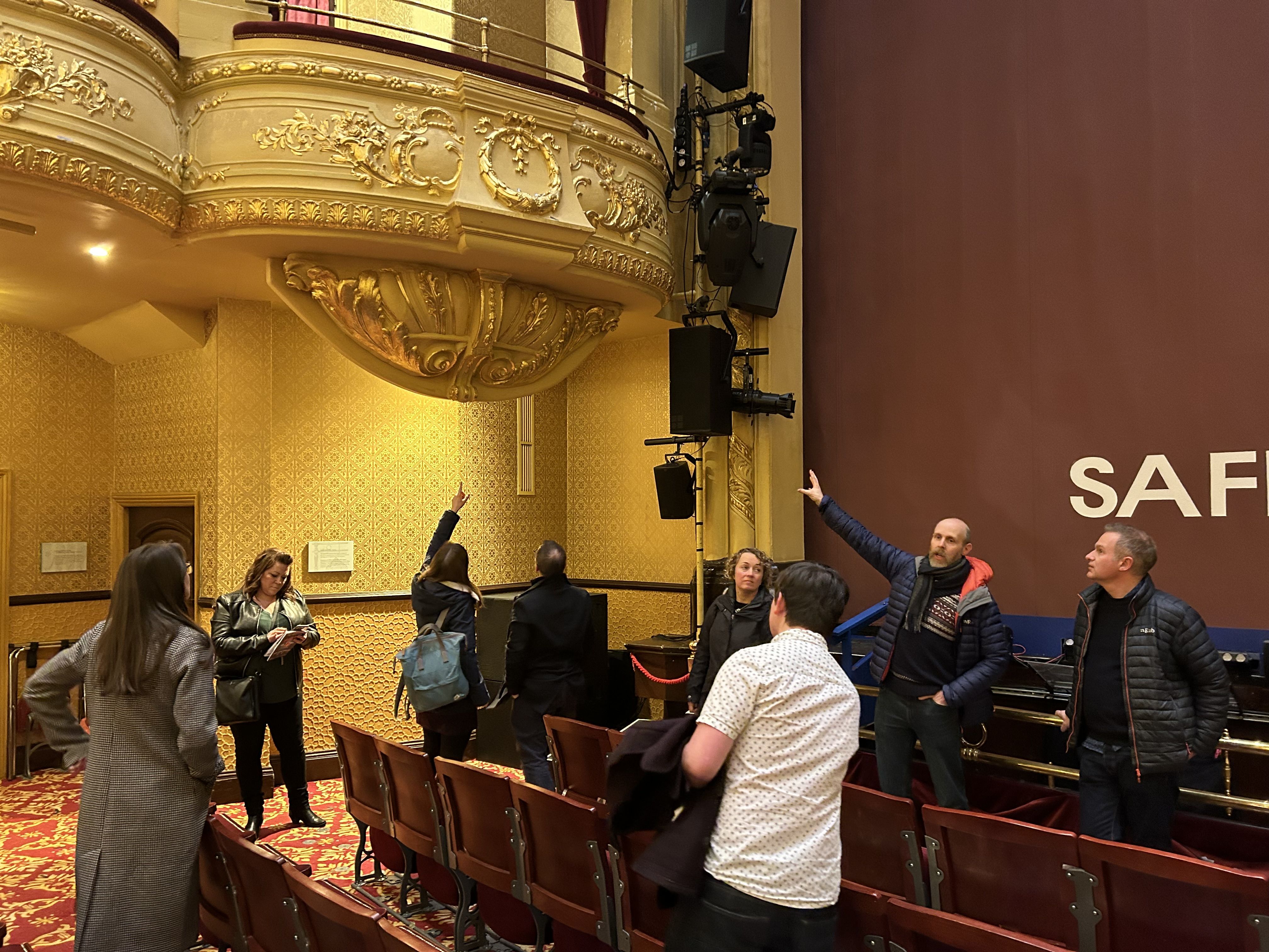 Post show, with strains of songs including ‘In The Navy’ still ringing in their ears, the team was treated to a unique viewing of the now empty auditorium by Natalie Collins, the Hippodrome’s hospitable and knowledgeable House Manager. David, along with colleagues, Grant Bramwell, Carinna Gebhard and Phil Lloyd, who were all involved in the theatre’s redevelopment, used the visit as a knowledge-sharing session. They took the opportunity to explain some of the carefully designed features, such as the splendid, ornate ceiling design which was painstakingly restored with gold leaf, and the wonderfully recreated sunburner, to some of their newer team colleagues.