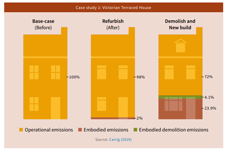 Approximately half of the embodied carbon in a building is accounted for by the foundations and external structure. Therefore, refurbishment of existing buildings could save a high proportion of this carbon and it is also clear that we will not be able to meet the 2050 targets, without significant improvements to our existing building stock.