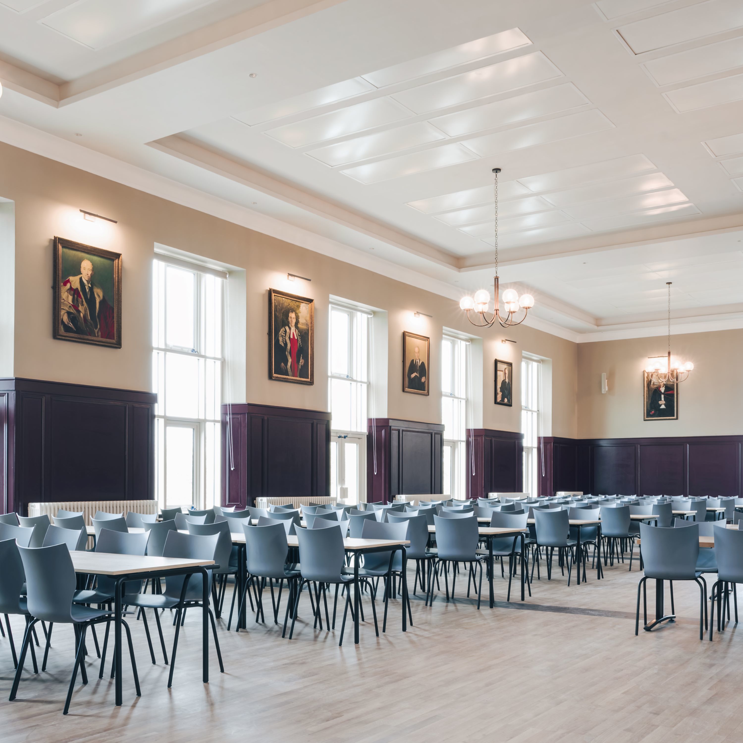 The project involved structural remodelling, a full replacement of the catering kitchen, servery, and refurbishment of the dining hall. The existing college bar was also renovated, and a new external garden space added.