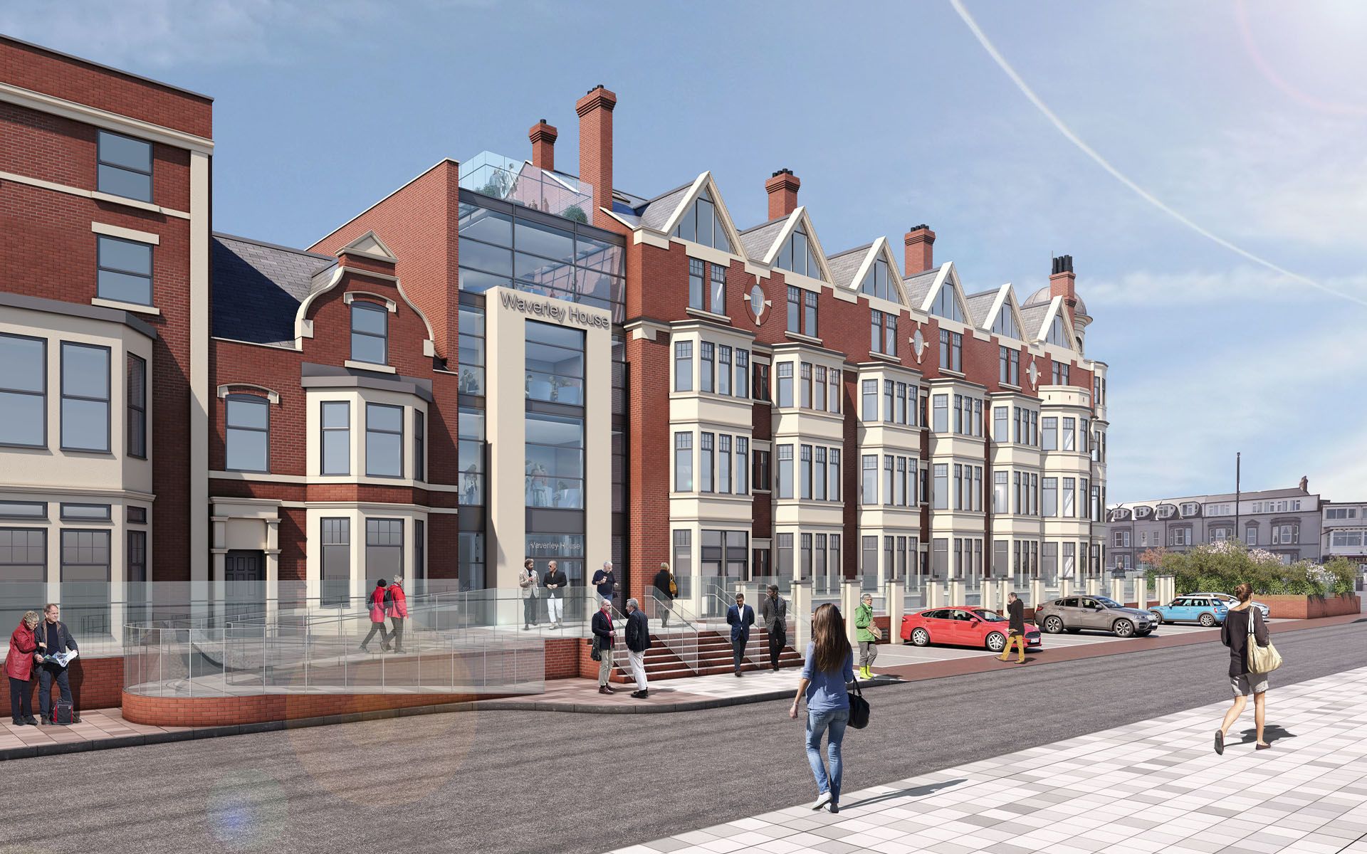 As stated above the proposal is to reuse the original hotel building whilst demolishing later extensions that are detrimental to the historic asset. A new fit for purpose extension is to be constructed to the rear with a lightweight mostly glazed infil between the new and existing. The original hotel side and rear facades will be visible from the circulation areas within this “transition” space. This space will also extend to form a ‘glass box’ insert with new entrance, foyer and social facilities between the original Rex Hotel and the adjoining terraced housing (formerly the original Waverley Hotel).