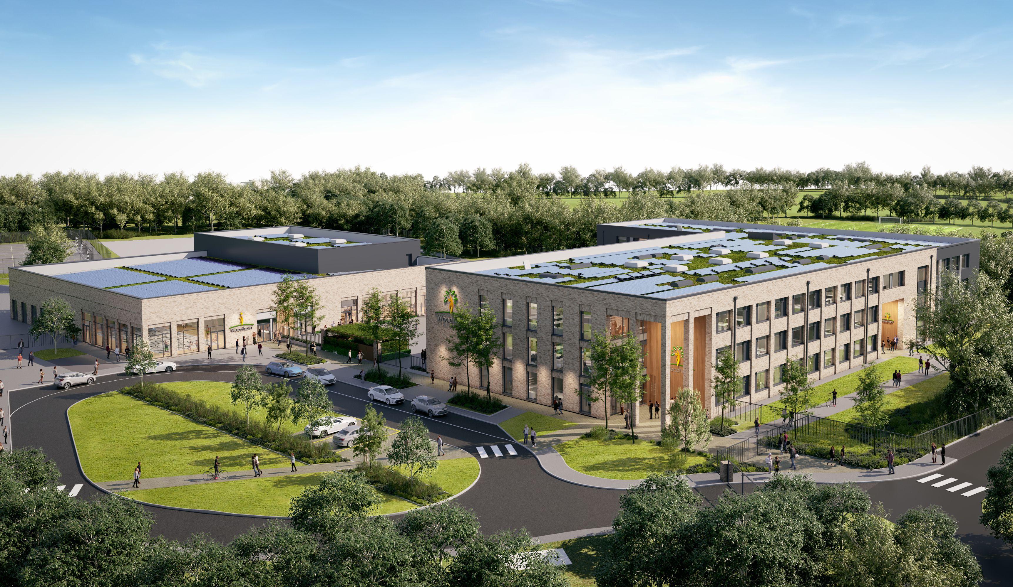 Key features of this new 1200-place secondary school include a green roof throughout and indoor swimming pool.