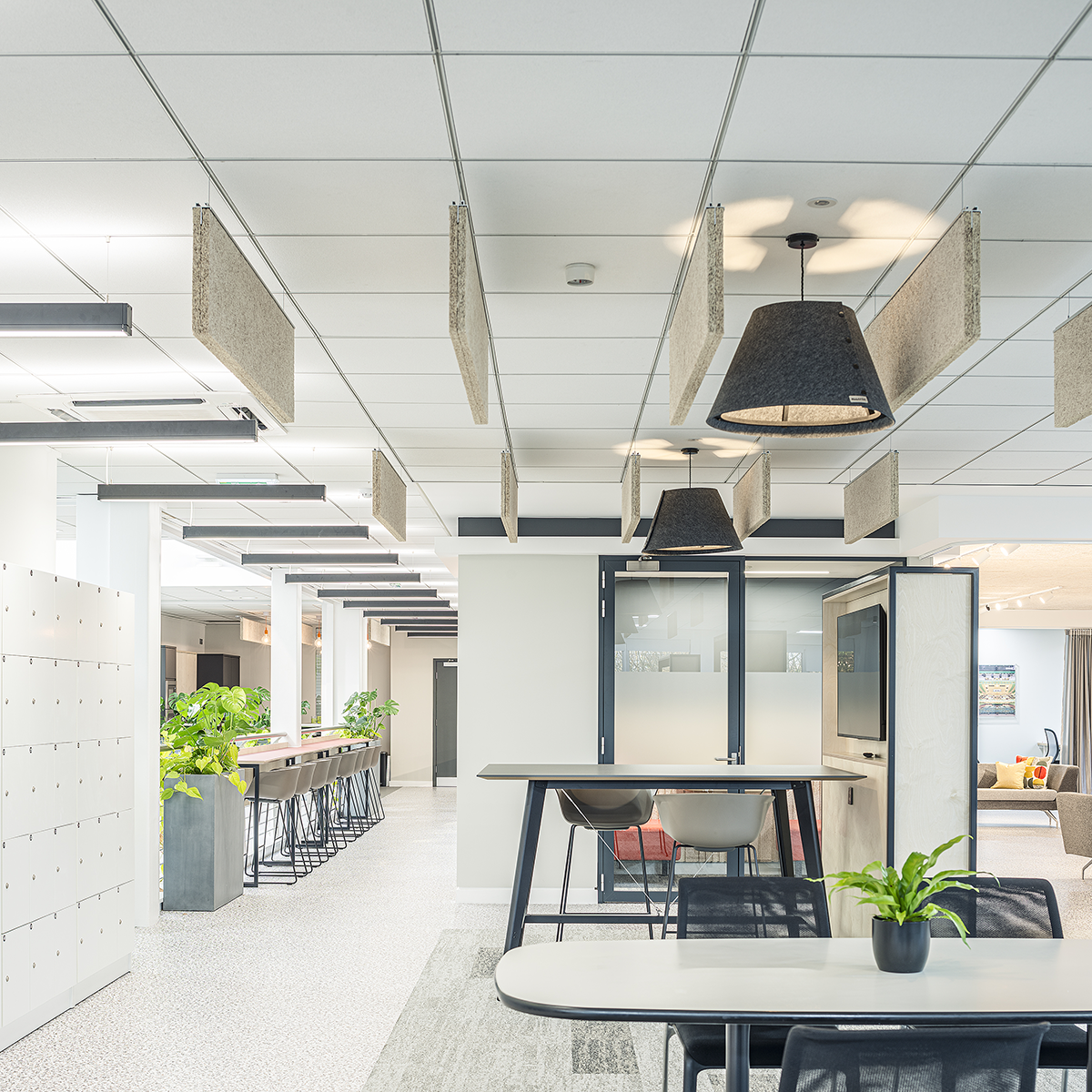 The office layout now features a variety of spaces, including standing desks, meeting pods, and informal seating arrangements. Touch-down stations and 2-and 4-person meeting rooms visually break up the open space and form a central, collaborative zone. These diverse options accommodate different working styles and support both individual and team preferences, with standing desks proving especially popular.