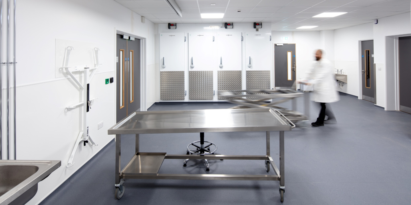 The Cadarveric Facility at Sunderland University is a rare example of a building designed with both life and death in mind. The design process reflected this, with attention paid to the sequencing of rooms within the facility (reception of donor, preparation, teaching) to maintain donor dignity, making sure that no human material is left unattended while in transit or in an unsecure location. Additionally, a Quiet Room was created for students and staff, offering a calming reception area for those who wish to take time out from the anatomy laboratory, and a restful and tranquil space for contemplation and counselling.