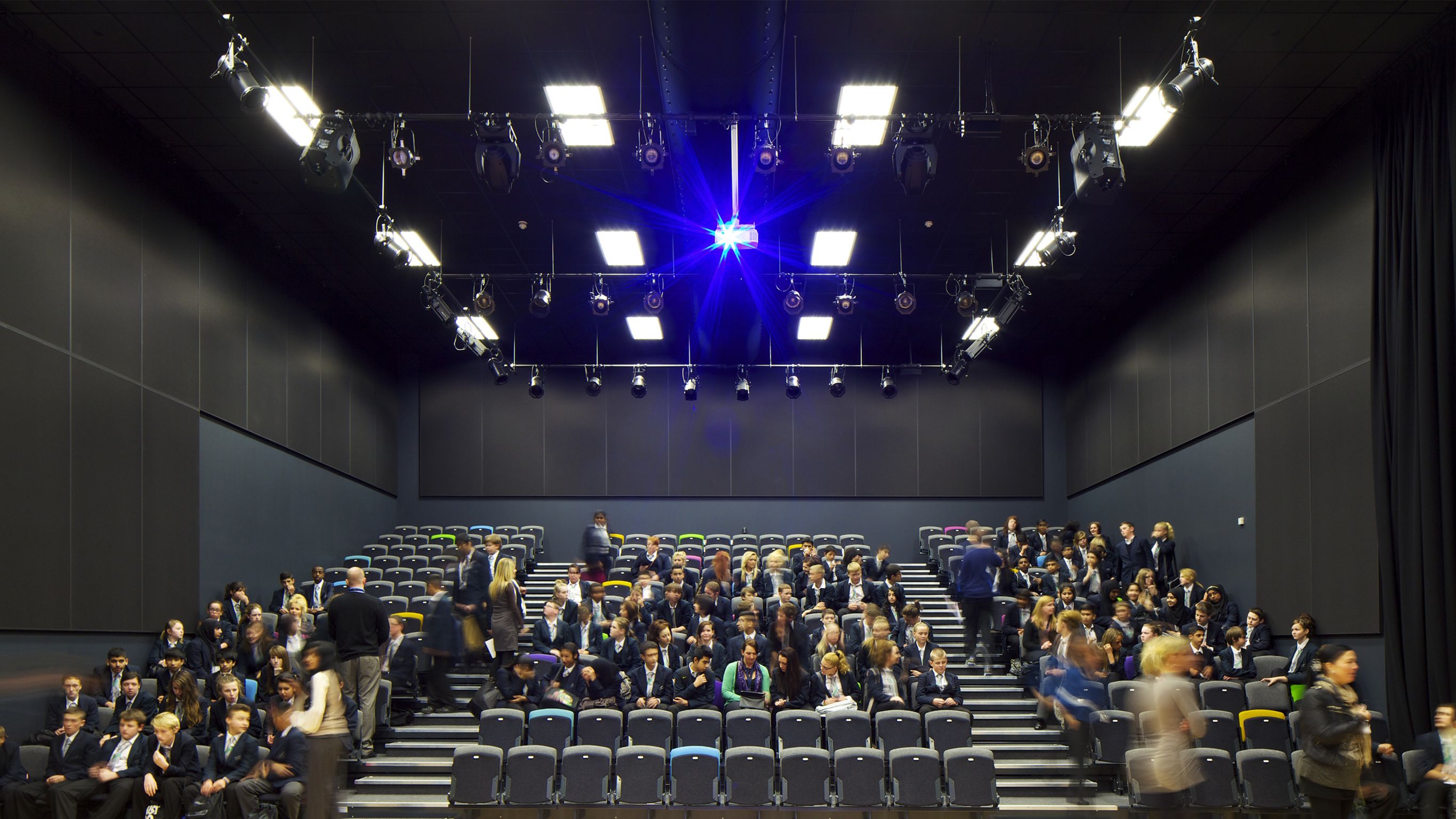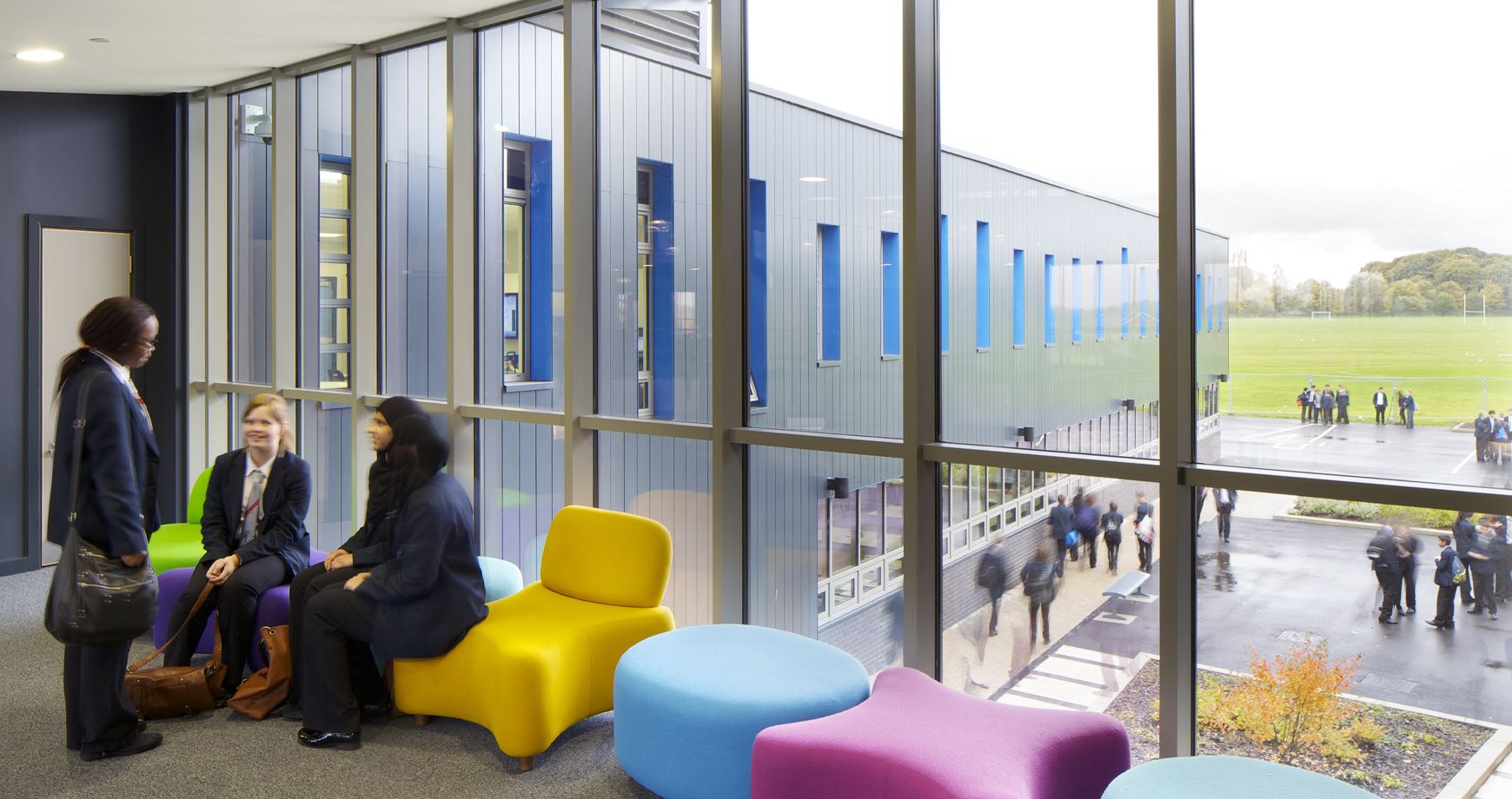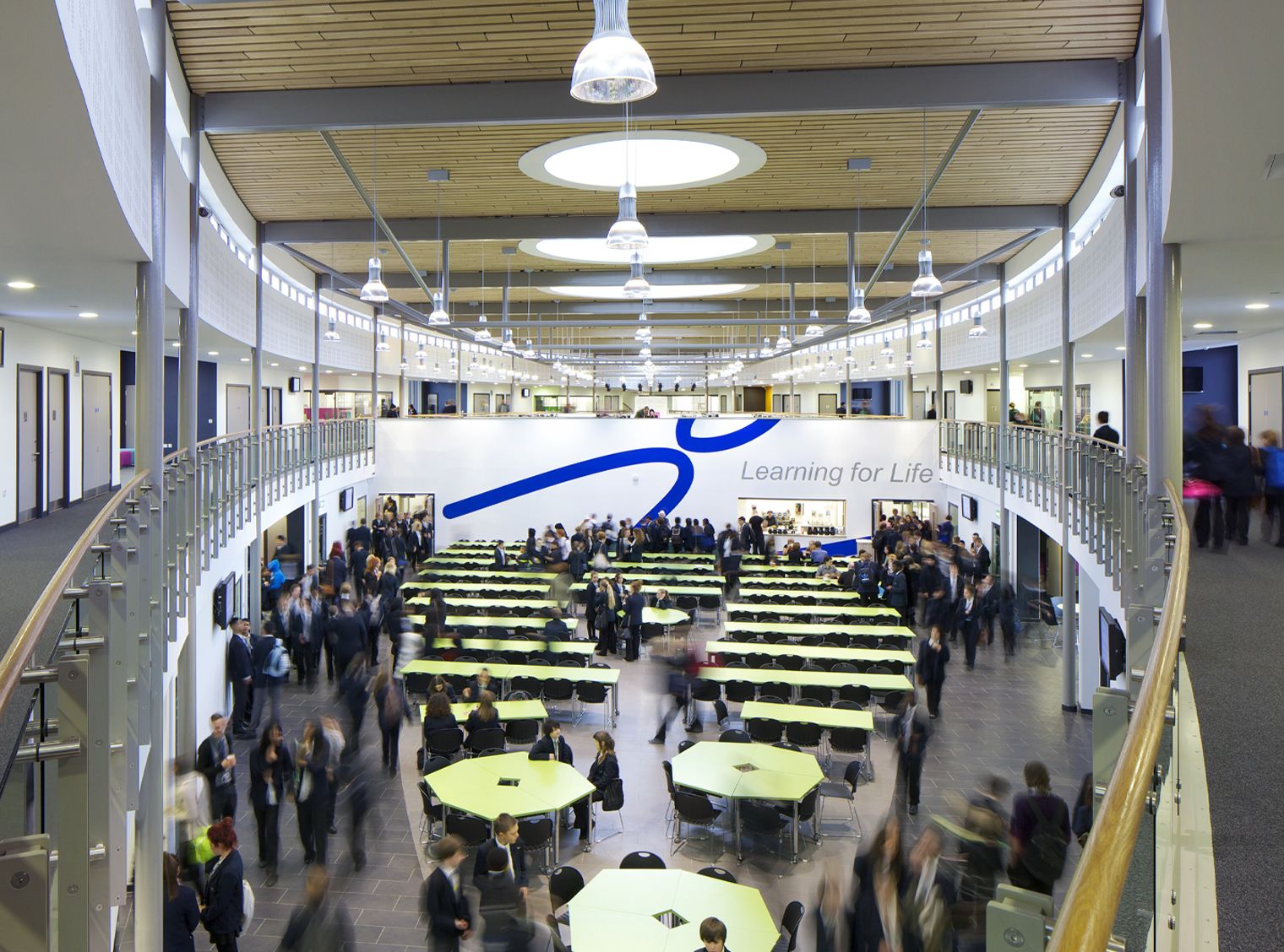 Flexible learning environments are grouped around the atrium, in blocks tailored according to faculty use and each with pastoral and leadership areas embedded to support a personalised learning pedagogy. The library and media centre is wrapped by two tapered wing roofs that symbolically link the school to its community, drawing in visitors, sports people and community groups extending the life of the school in the evenings, at weekends and over summer. It is a truly flexible, interactive and inspirational space for all.