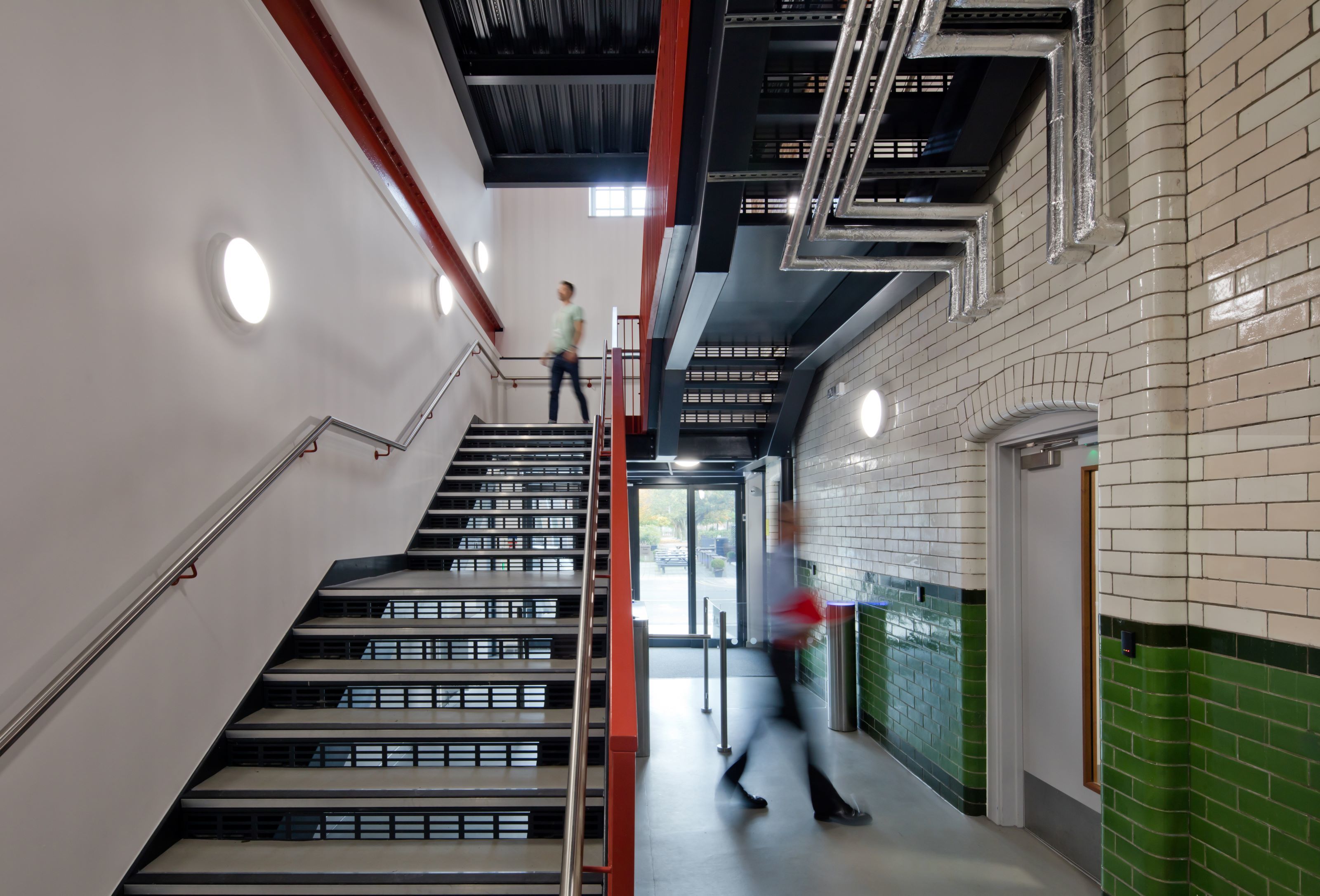 The larger arched openings had been bricked up in the 1980s, so we looked to utilise one as the new main entrance. This provides clarity and leads to the new accommodation stair, which is unashamedly contemporary but compliments the adjacent refurbished glazed brickwork, which was exposed once again after being covered for years. The simple yet bold stair design connects the multiple levels of the building and aids with wayfinding. A new lift is also incorporated, ensuring accessibility is seamlessly provided throughout.