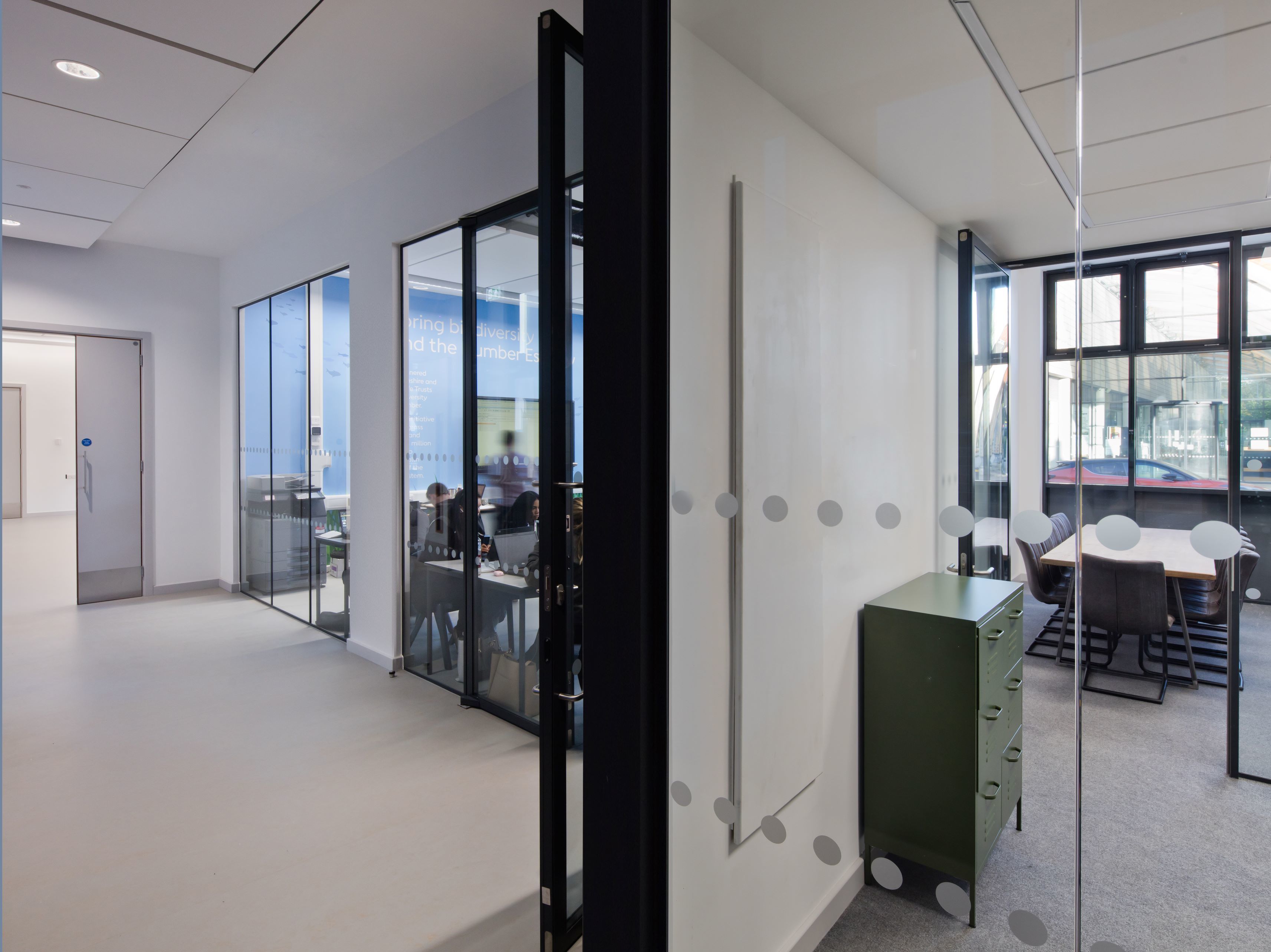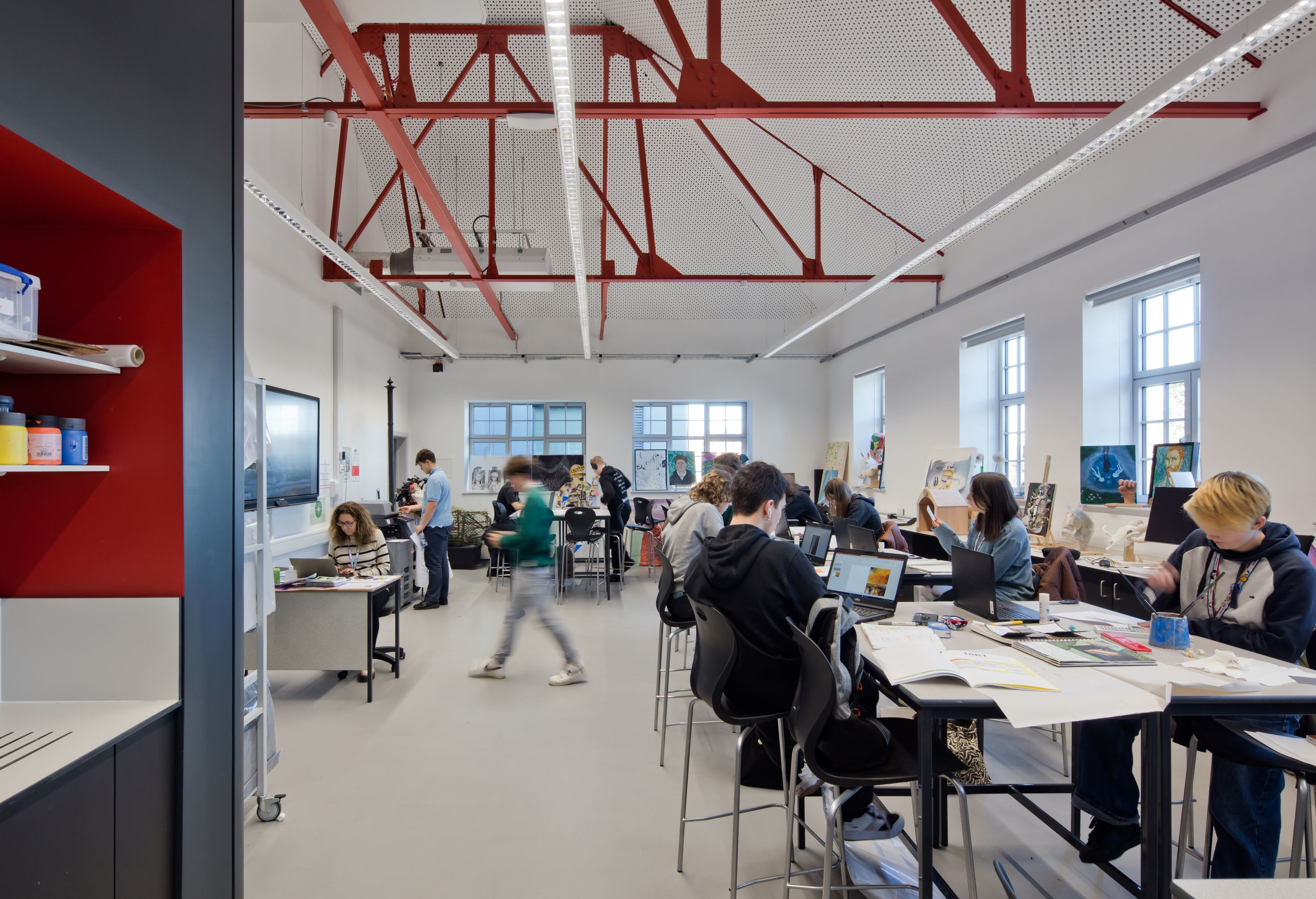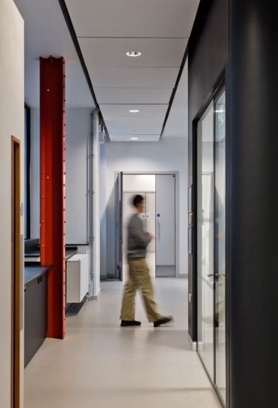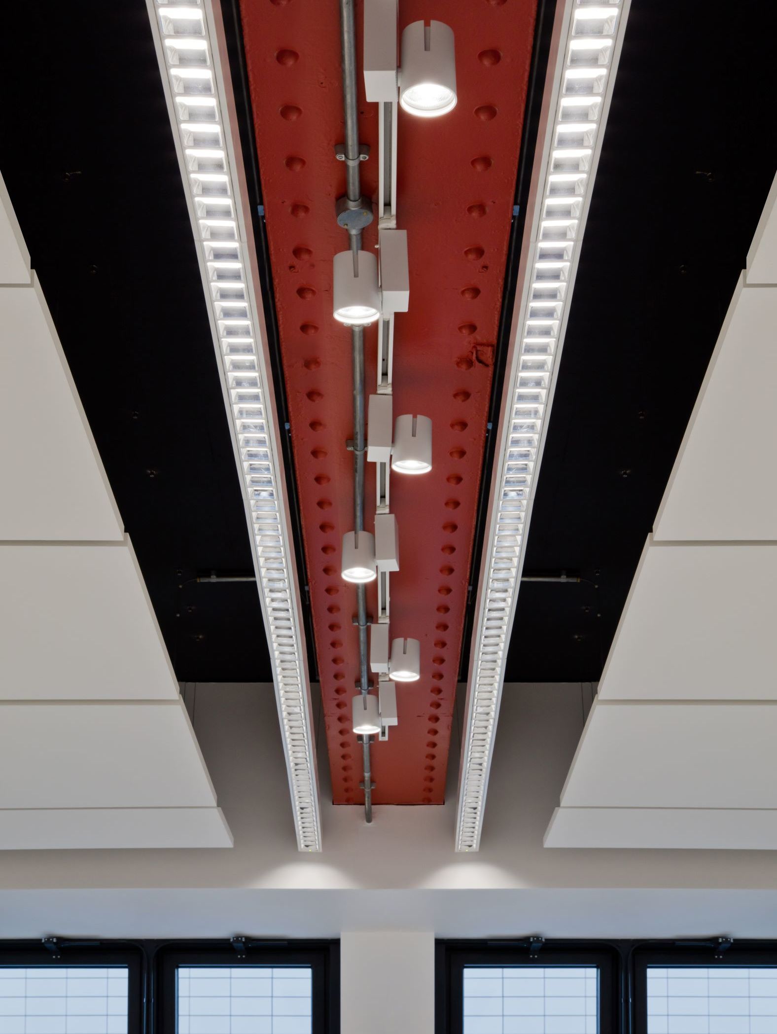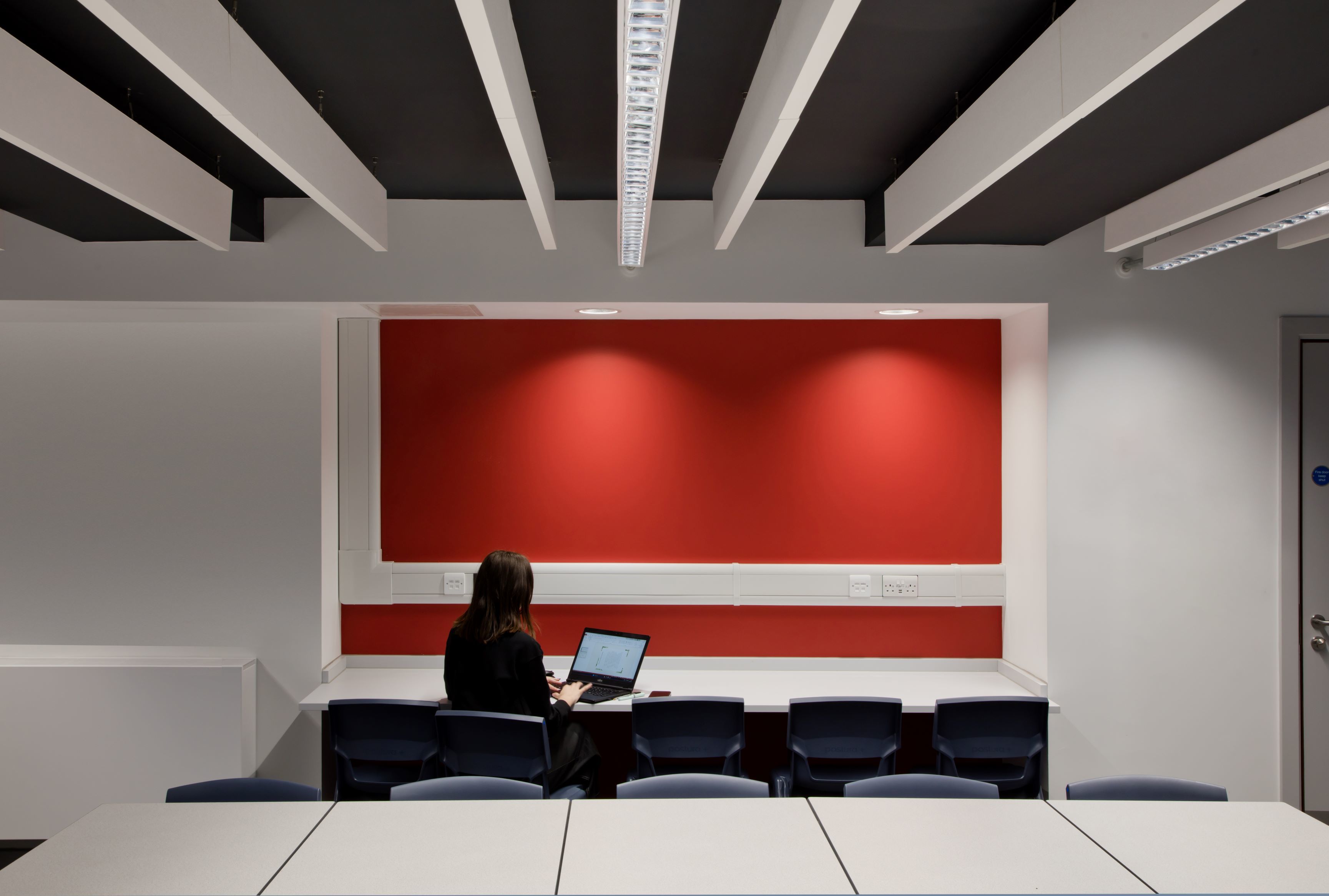 Overall, the building utilises a simple material palette, incorporating raft ceilings, muted tones to flooring, expressing the 'pods' in a dark colour, maximising the extent of glazed partitioning whilst also celebrating the historic and new elements of steelwork in a vibrant red.