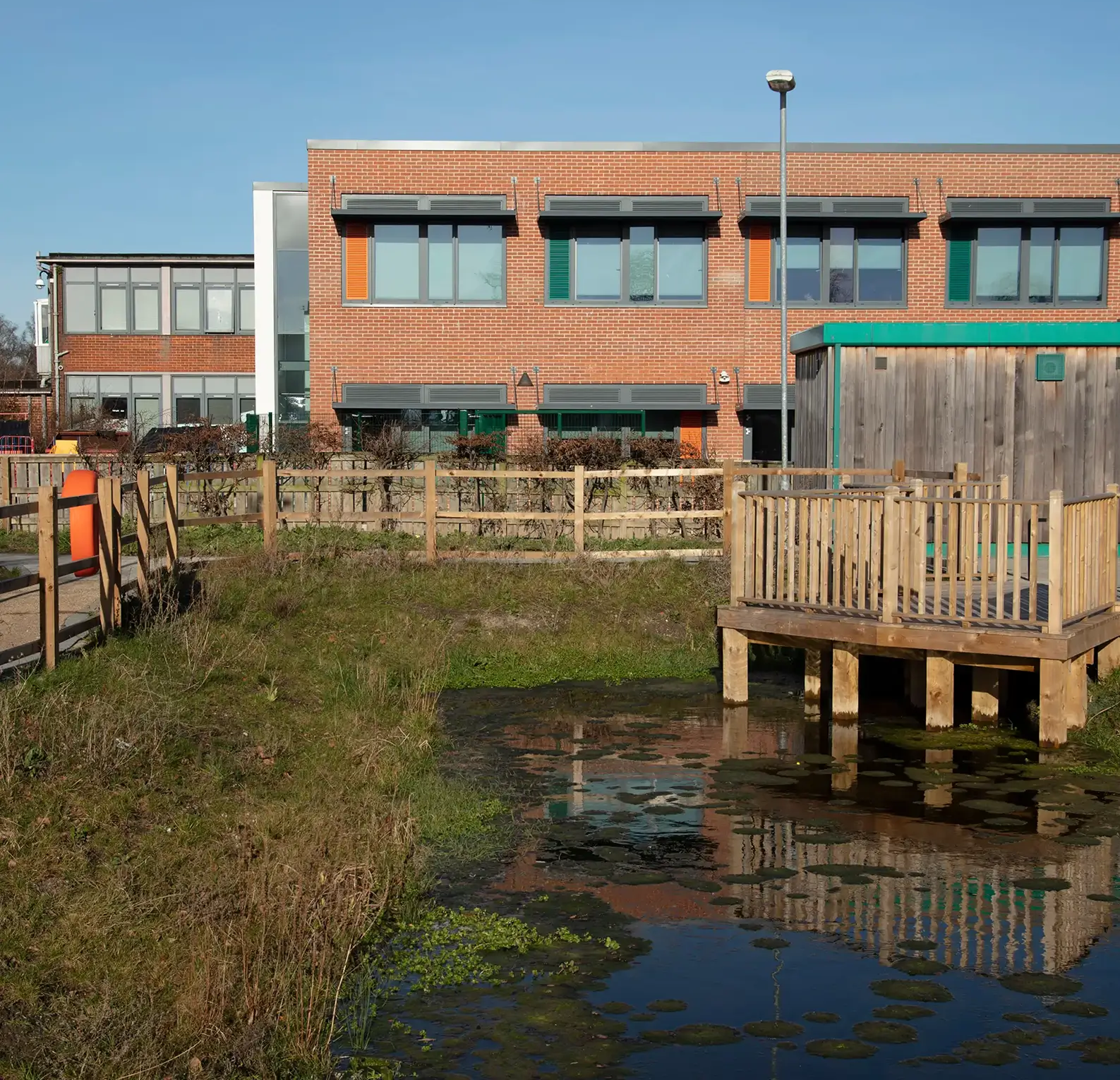 Positioned alongside the town’s allotments, the extension and new pond connect the school to its wider community through landscape and ecology. These outdoor spaces support a calm, shared edge between learning and local life.